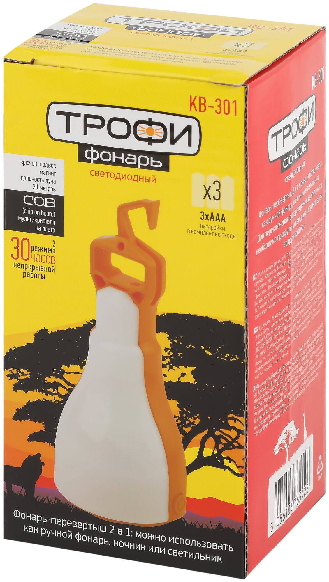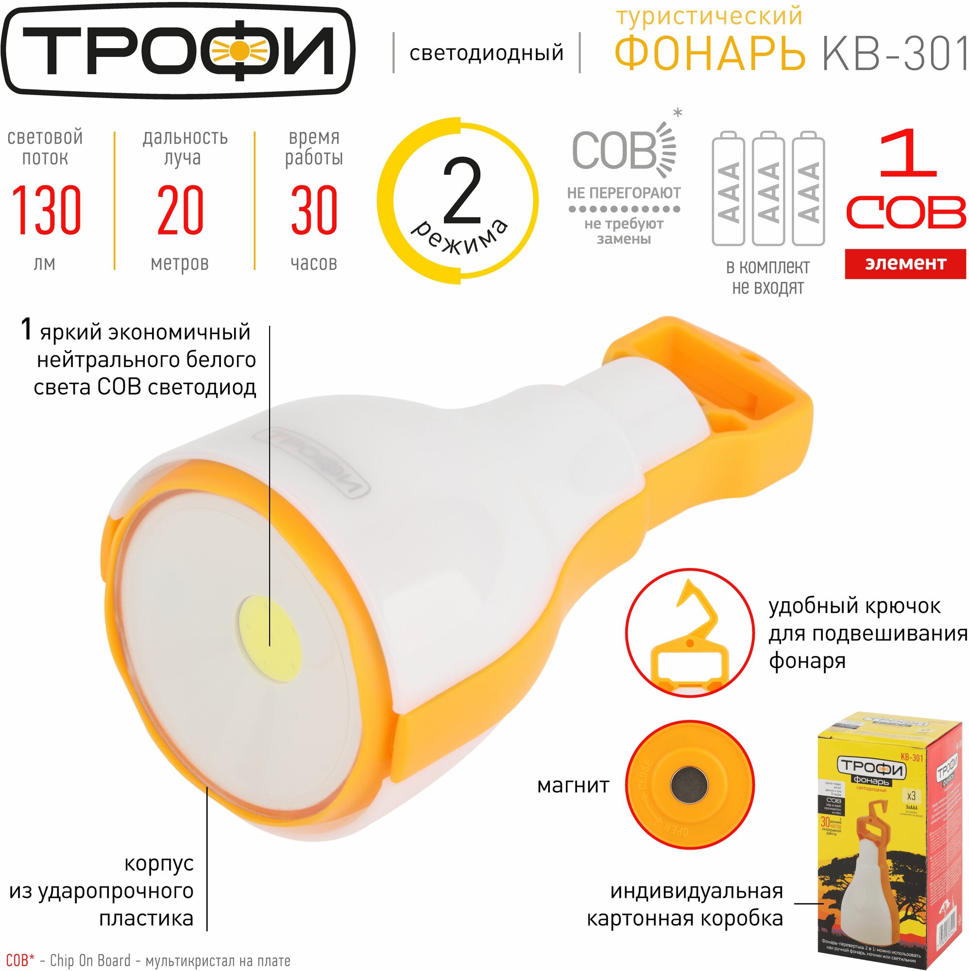 Type: camping lantern, light source: LEDs, power type: batteries, features: impact-resistant housing, luminous flux: 130 lm, lighting range: 20 m, maximum operating time: 30 h, housing material: plastic