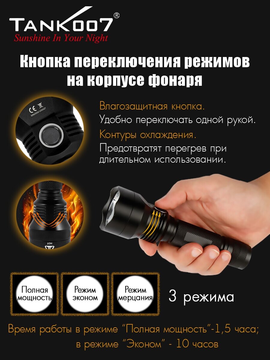 Built-in voltage stabilizer, lanyard, a set of spare seals; battery type: ICR18650; detailed equipment: - LED lamp TANK007 PT12XM-L - 1 pc.; - Lithium-ion battery 18650 3.7v 2600mAh - 1 pc.; - Adapter cord