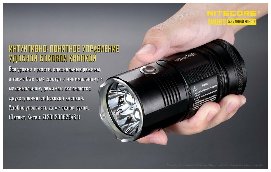 Battery type: ICR18650; detailed equipment: flashlight, wrist strap, Nitecore branded case, o-rings, instructions; number of batteries: 4; number of operating modes: 8