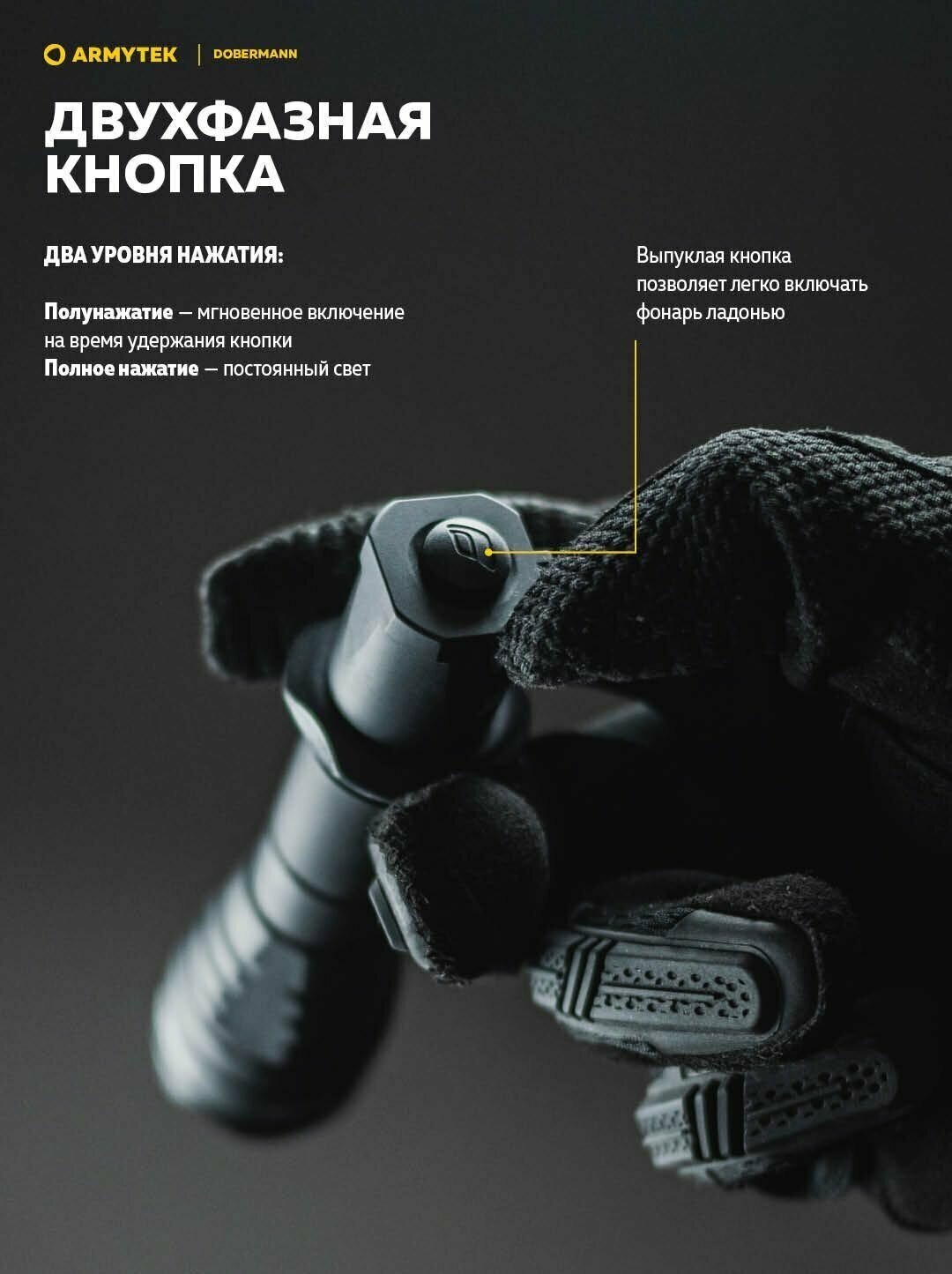 Type: tactical flashlight, light source: LEDs, power type: batteries, own battery, features: moisture protection, emergency beacon, short circuit protection, overvoltage protection, mechanical