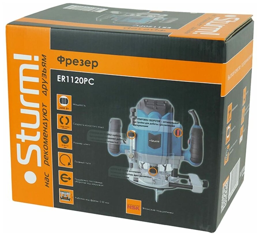 Equipment: Collet 6 mm, collet 8 mm, wrenches 13 mm and 22 mm, plunge milling base + adapter for connecting to a vacuum cleaner, edge base + adapter for connecting to a vacuum cleaner, inclined base, contour guide, �