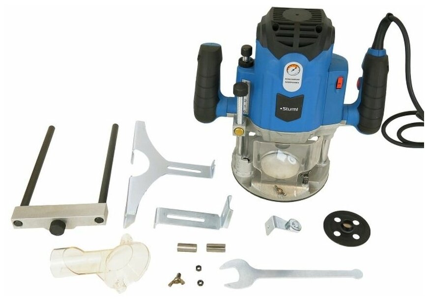 Collet 6 mm, collet 8 mm, wrenches 13 mm and 22 mm, plunge milling base + adapter for connecting to a vacuum cleaner, edge base + adapter for connecting to a vacuum cleaner, inclined base, contour guide, �