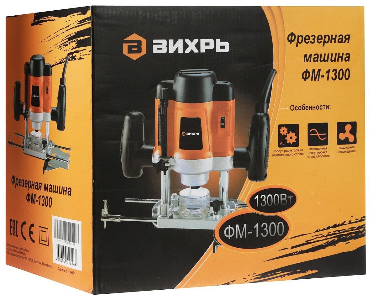 Equipment: Side stop 1 pc., dust outlet 1 pc., collet 6 mm 1 pc., collet 8 mm 1 pc., open-end wrench 1 pc., adapter plate 1 pc., center 1 pc., rod for fixing the side stop 2 pcs. .