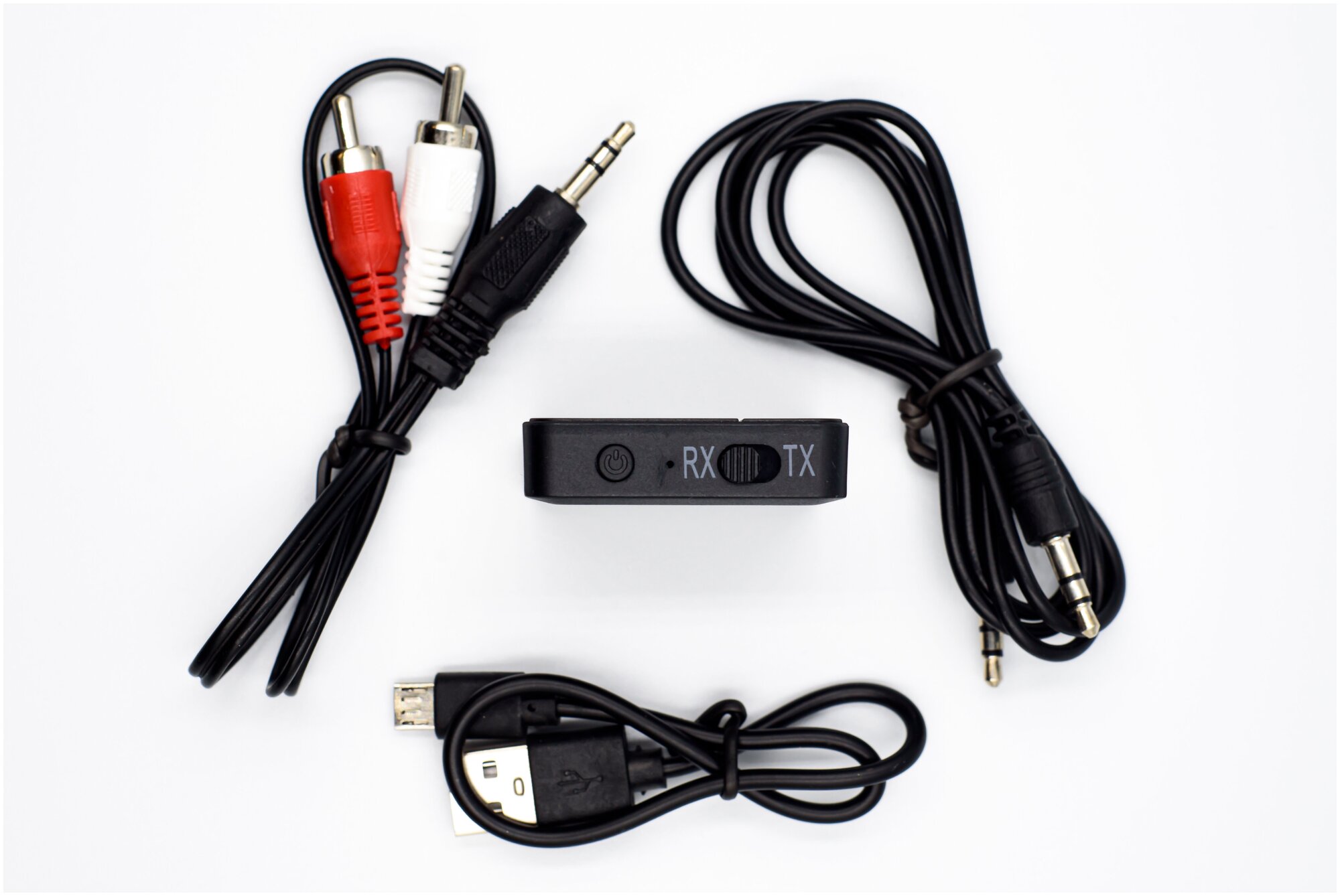 Audio receiver/transmitter, 3.5 mm jack - RCA x2 cable, micro USB - USB cable, 3.5 mm jack - 3.5 mm jack cable