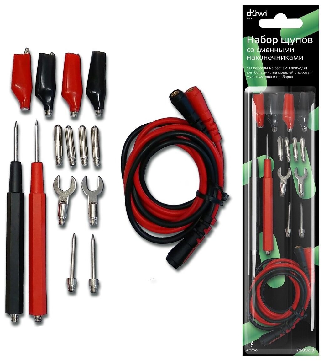 Wire for probes: red 1 pc, black - 1 pc; shupy - 2 pcs, needles - 2 pcs, forks - 2 pcs, banana - 4 pcs, crocodile - 4 pcs