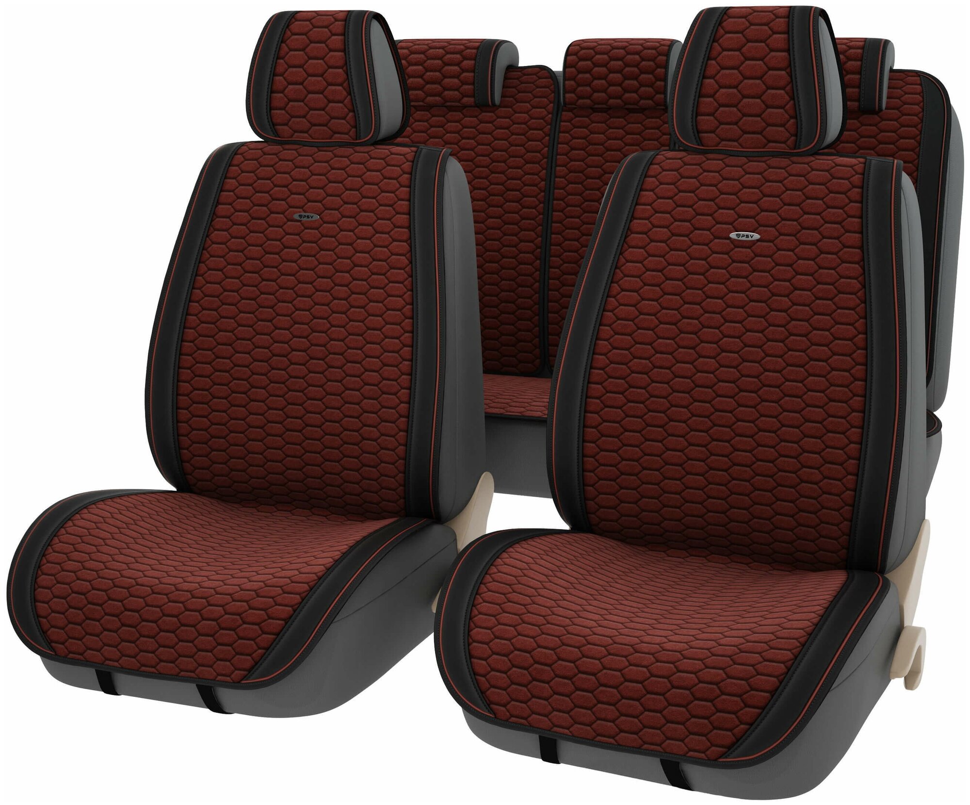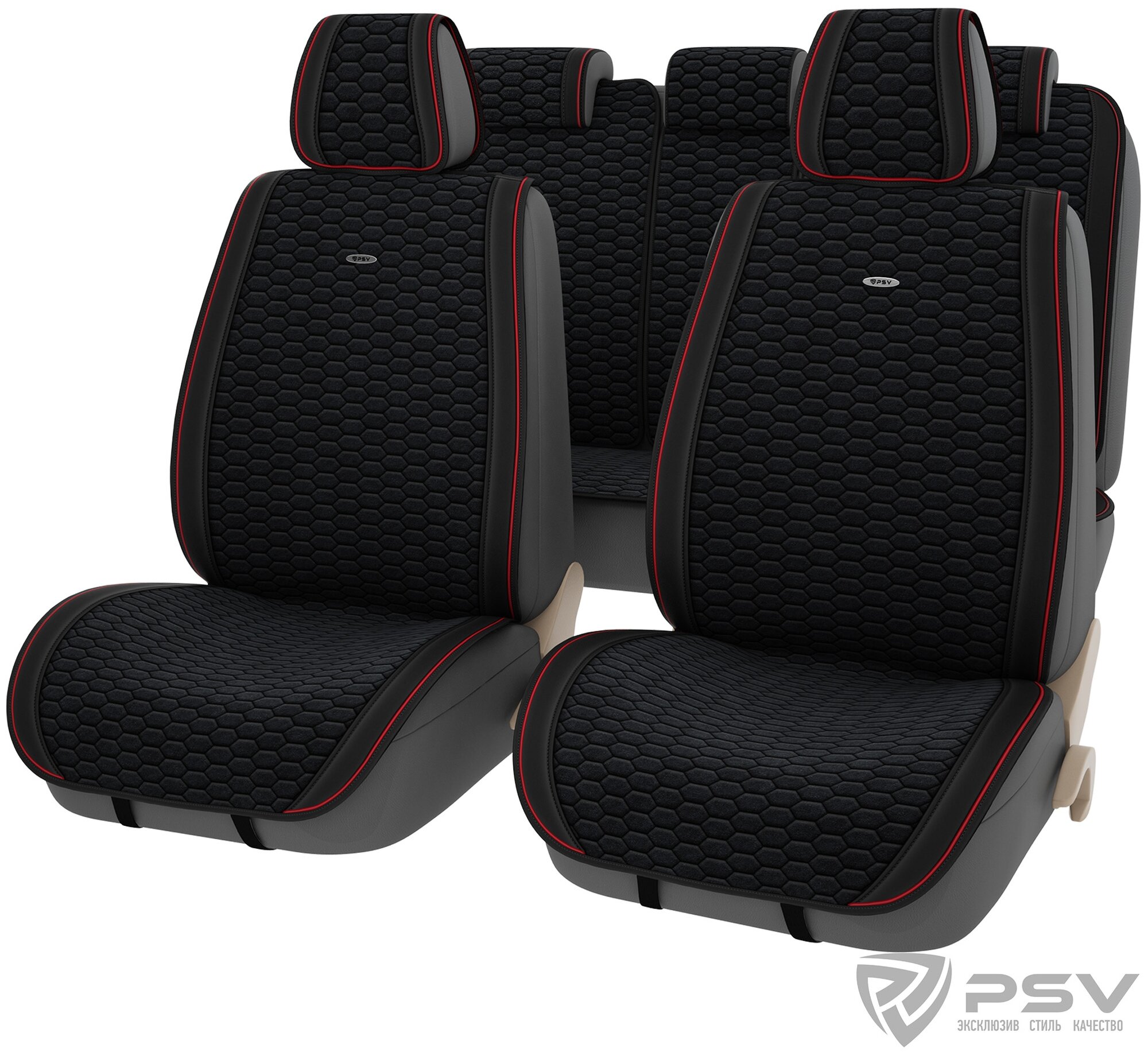 2 front covers 125x55, 2 rear backrests with molded headrests 87x53, 2 L-shaped front headrests 48x23, 1 rear seat 135x50, 1 insert for rear backrest 52x20, 1 L-shaped rear headrest 24x24
