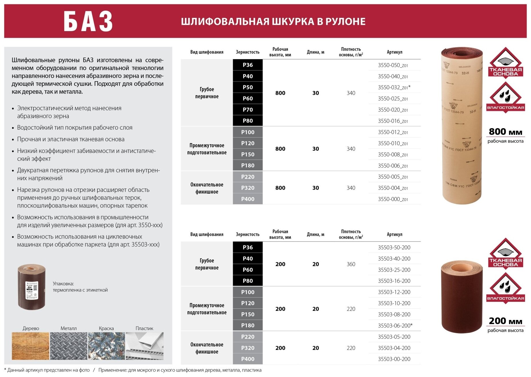 Type: roll, purpose: universal, length: 30000 mm, width: 800 mm, grit P: 120, water resistance