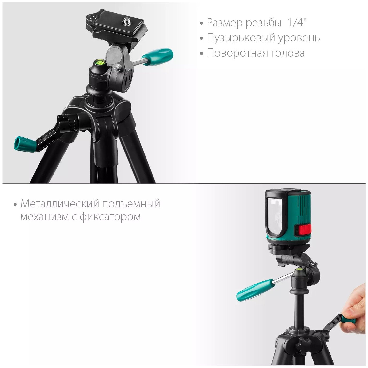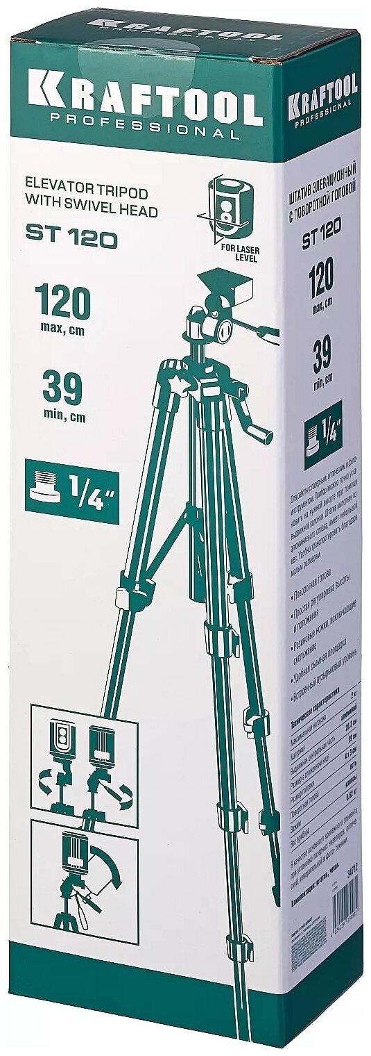 Type: tripod, purpose: for laser level, length: 1200 mm, tripod features: folding design, elevation head, device thread: 1/4", equipment: level, case