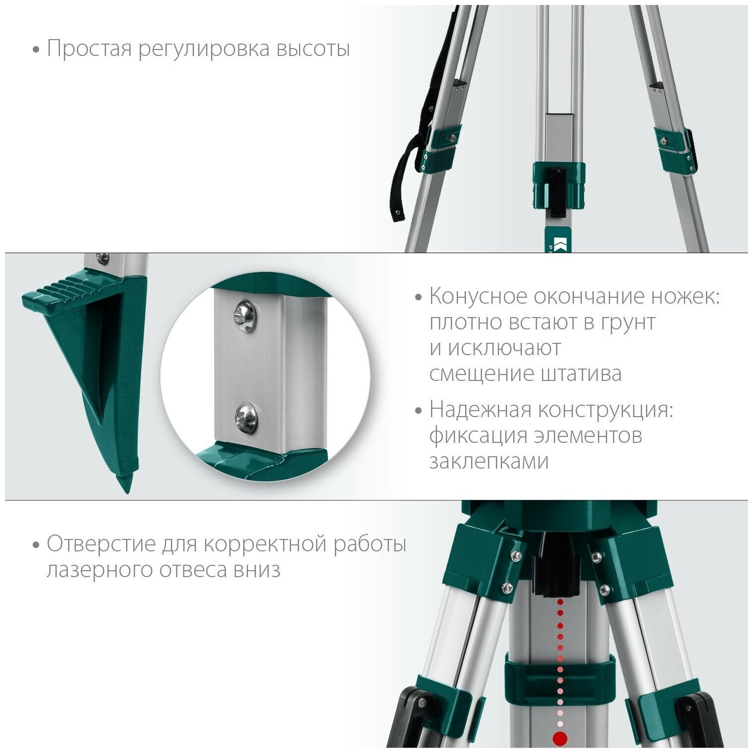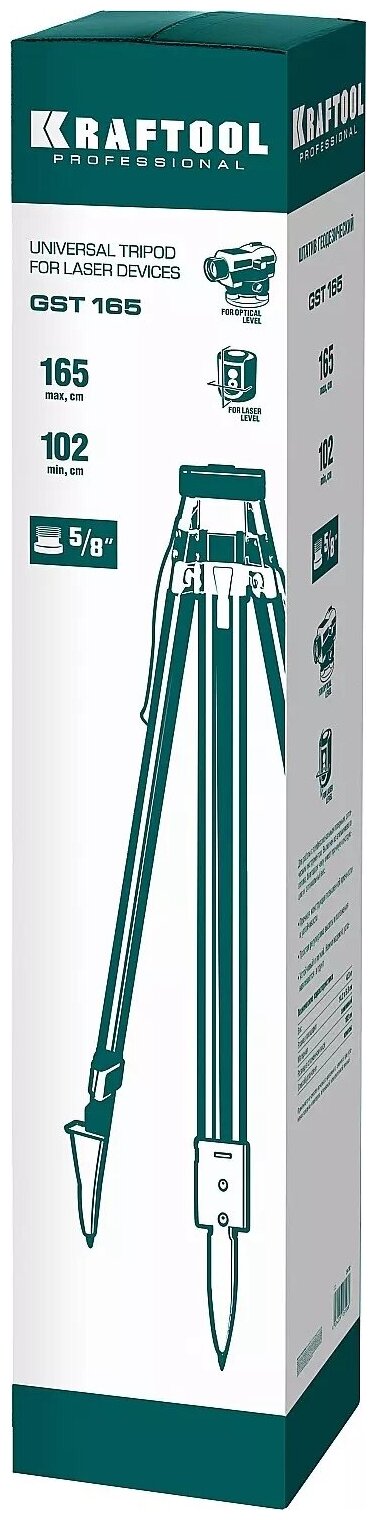 Type: tripod, purpose: for laser level, length: 1650 mm, tripod features: folding design, telescopic, device thread: 5/8", package contents: case