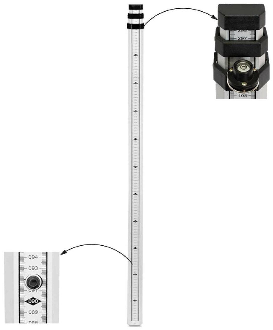 Bubble level included aluminum; on one side of the rail there is a millimeter scale, on the other - E-graduation