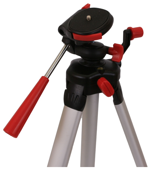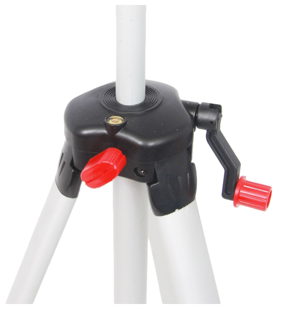 Handle for adjusting the rotation and tilt of the holder; three-legged tripod with fixation; bubble level for vertical installation