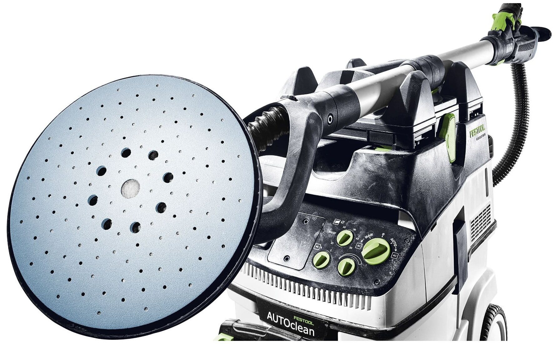5 pcs of grinding wheels, clip-on, mains cable, systainer, handle extension, cable holder, sanding pad