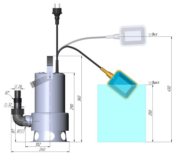 Pump - 1 pc., Universal fitting 11/2 female thread - Ø32 mm - 1 male thread - Ø26 mm, Angle 90º 11/2 male thread - 11/2 male thread, Installation and operating instructions, Packing