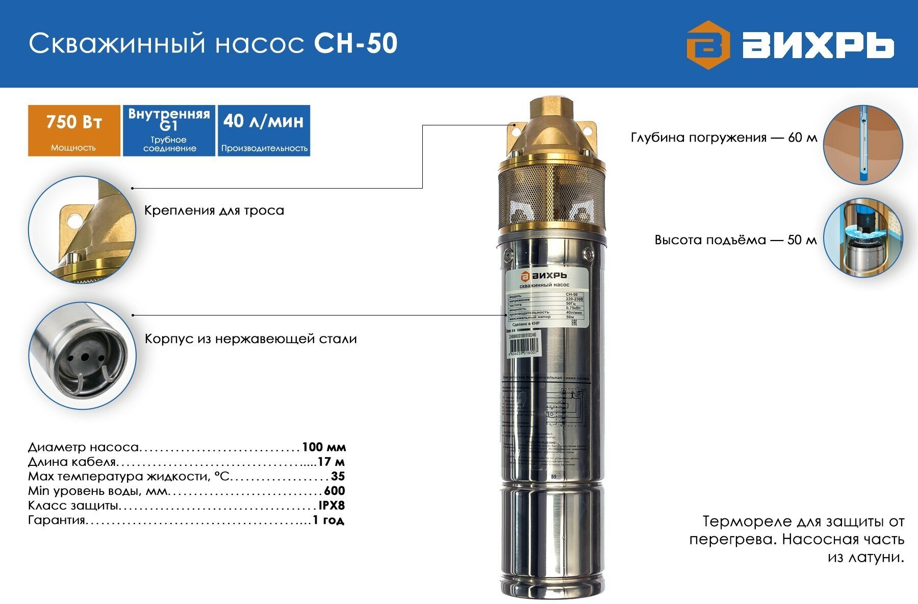 Degree of protection IPX8, the condenser plug is, the material of the pump part is brass