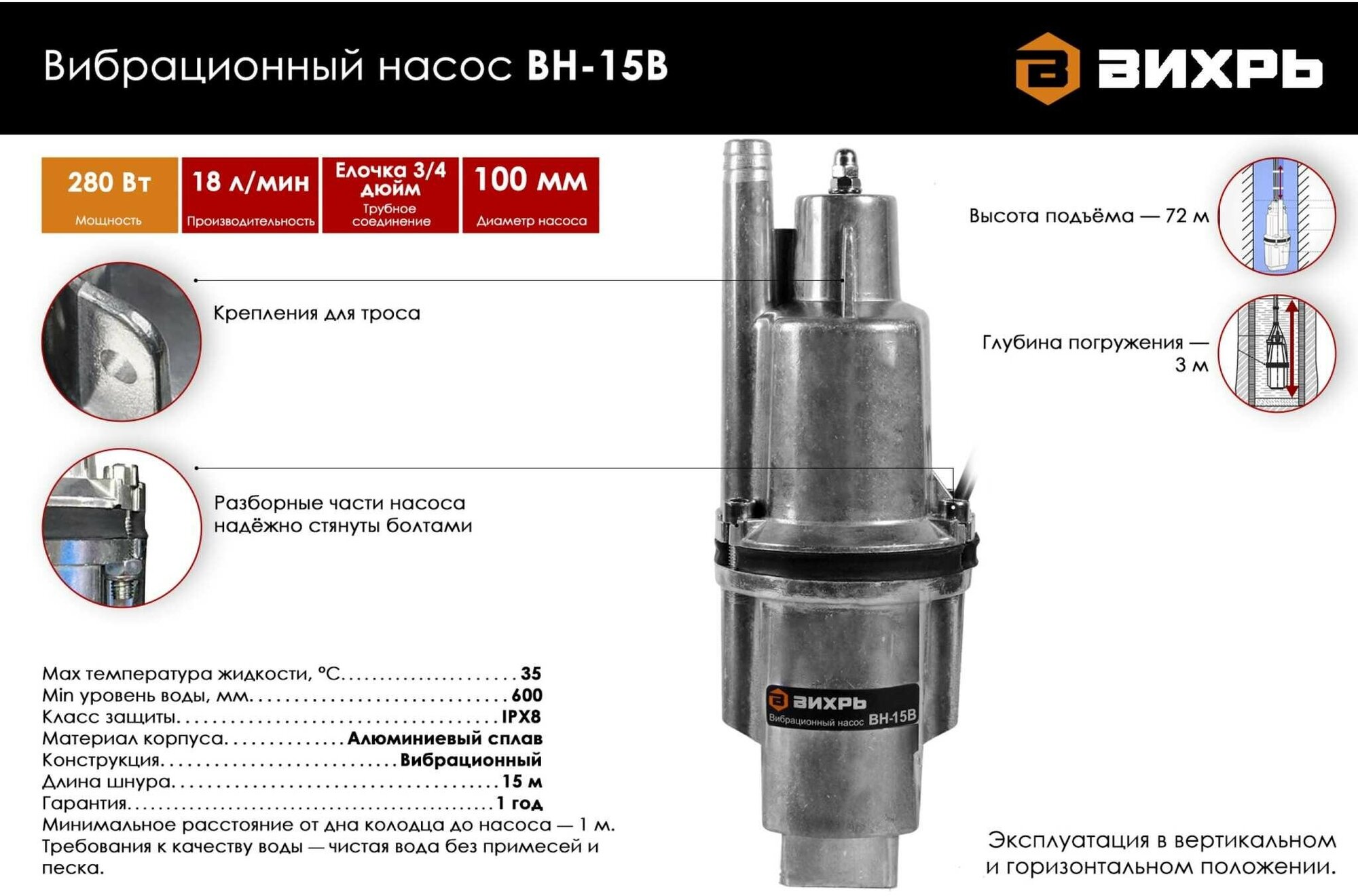 Upper water intake; pump diameter 100 mm; minimum well diameter 110 mm; degree of protection IPX8