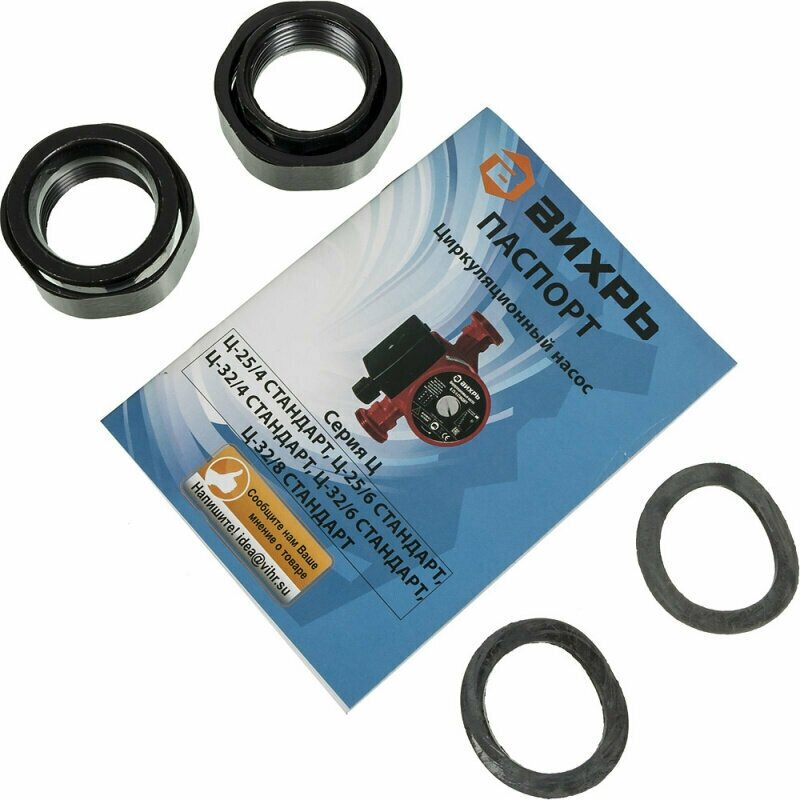 Circulation pump: 1 pc, swivel with union nut: 2 pcs, rubber gaskets: 2 pcs, passport: 1 pc, packaging: 1 pc