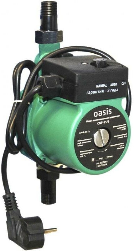 Productivity 25 l/min; 3 operating modes: MANUAL - the pump continues to work when it is plugged in, AUTO - the pump automatically starts / stops using the valve tap, OFF - the pump does not work even when connected