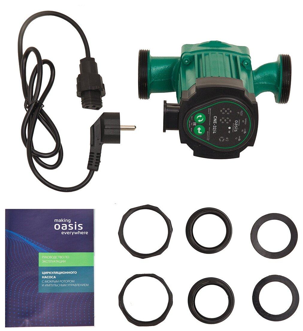 Pump 1 pc, rubber gaskets 2 pcs, data sheet 1 pc, swivel with union nut 2 pcs, electric cable 1 pc, packaging