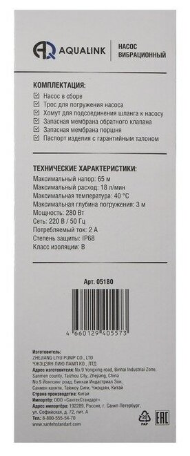 Vibrating AQUALINK VP U-65/18-10, 280 W, lower intake, 18 l/min, head 65 m, 10 m. Packing unit: 1