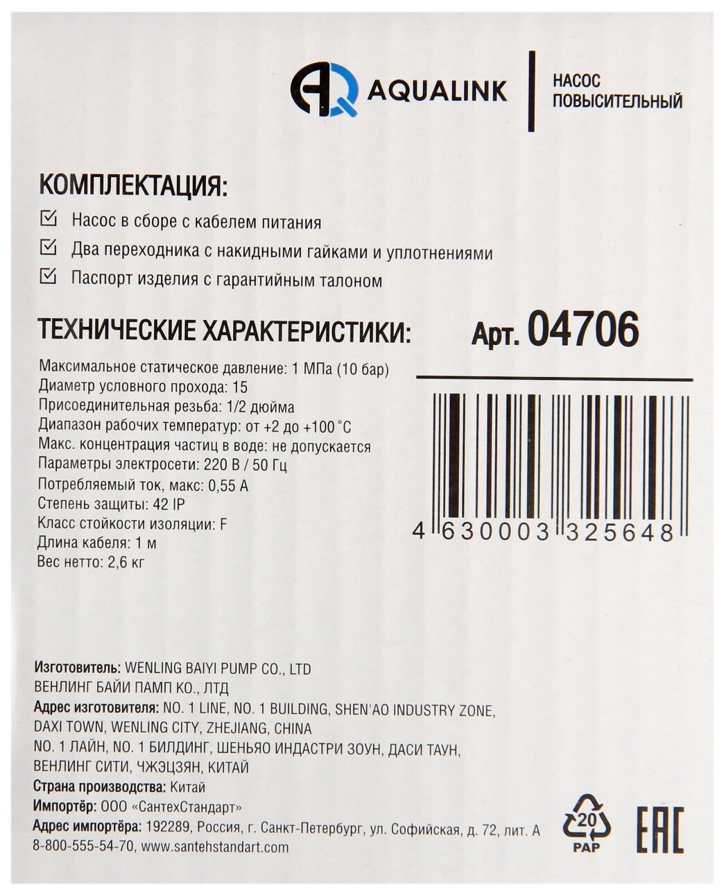 Pump assembly with power cable, 2 adapters with union nuts and seals, product passport with warranty card