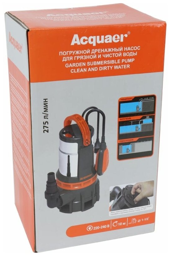 Pump, angled pipe, outlet fitting, instruction manual, packaging.