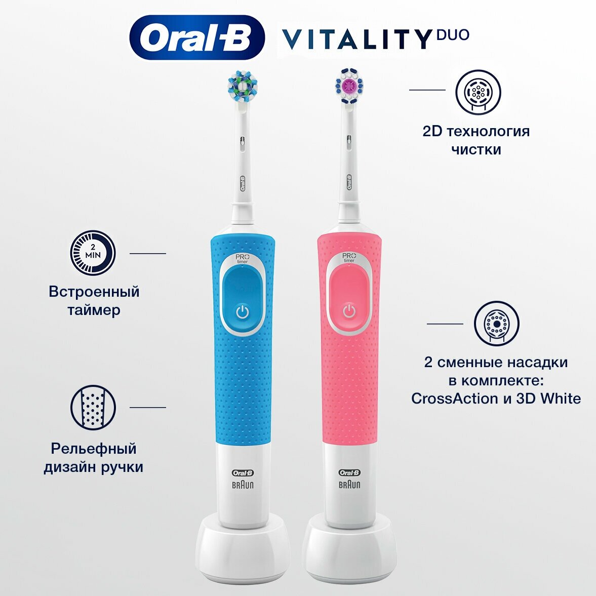 Detailed equipment: Electric toothbrush 2 pcs., 2 interchangeable heads: 3d white and cross Action, charger 2 pcs.