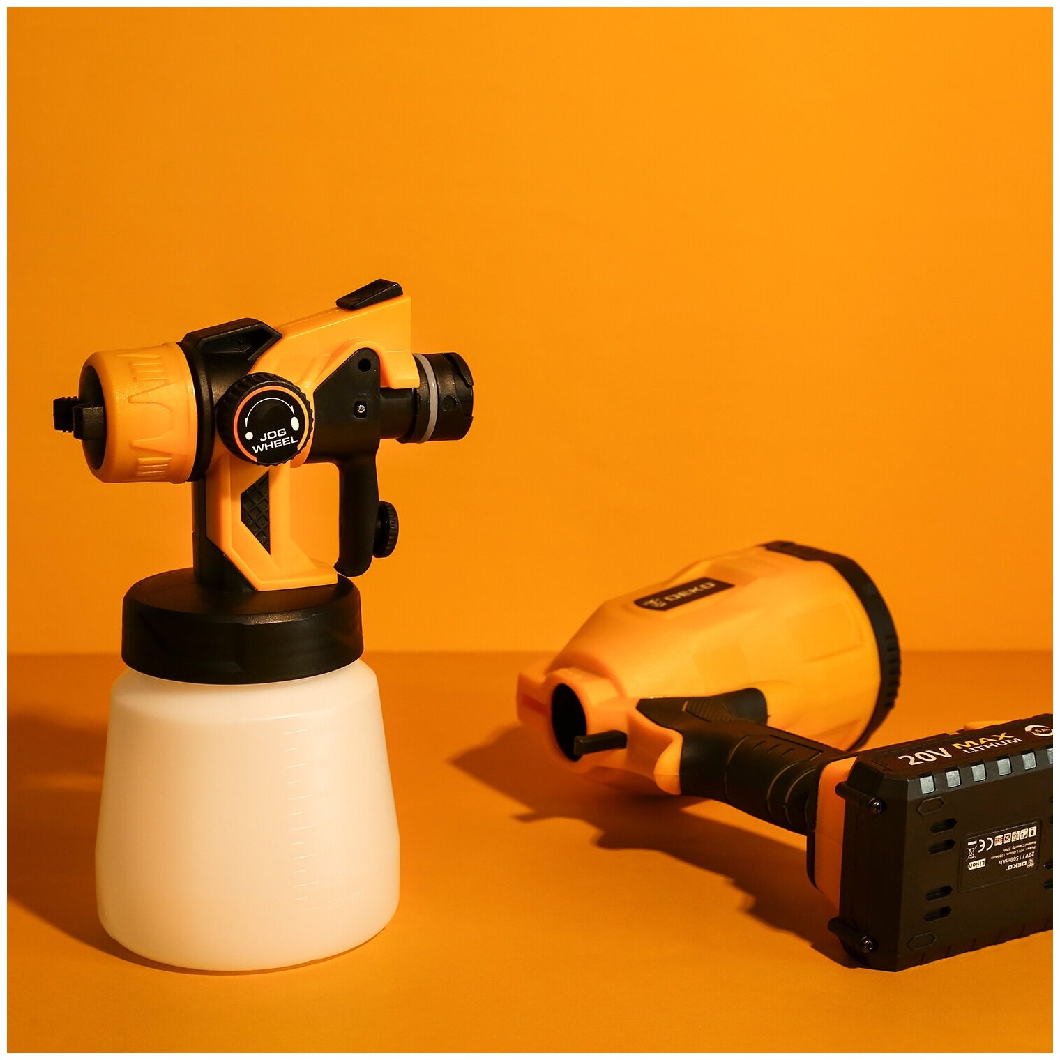 Type of power supply: mains, principle of operation: air, spraying method: HVLP, power: 120 W, current frequency: 50/60 Hz, tank volume: 0.80 l, tank location: bottom, maximum material viscosity: 70 dyn⋅sec/cm², viscometer, coating
