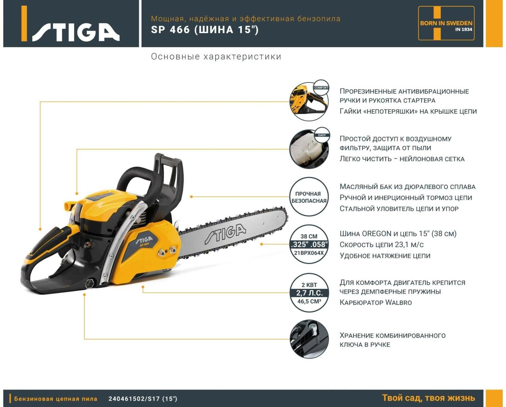 Engine type: gasoline, Power W: 2000 W, bar length: 38 cm, chain pitch: 0.325 inch, engine size: 46.50 cm³, anti-vibration, weight: 5.30 kg