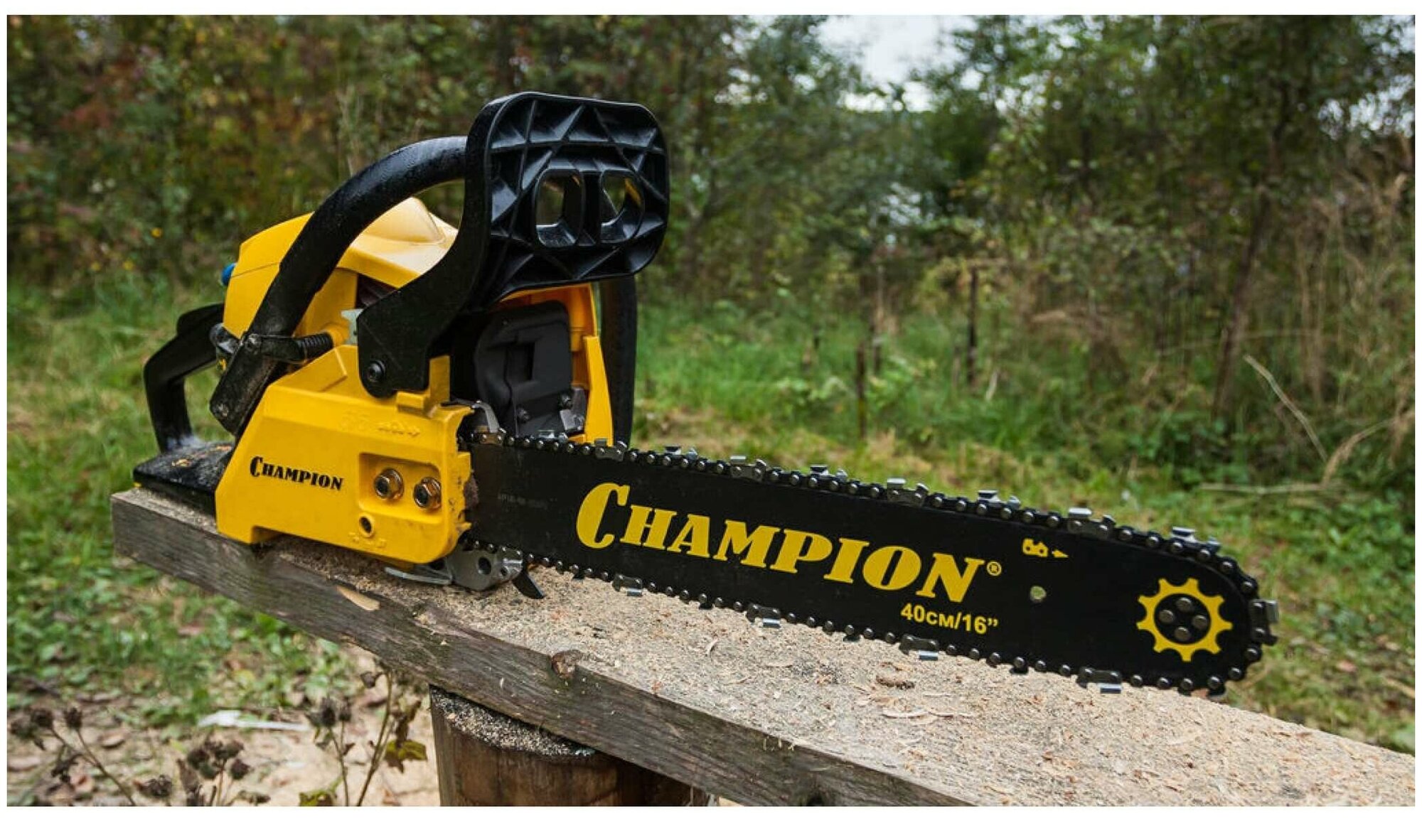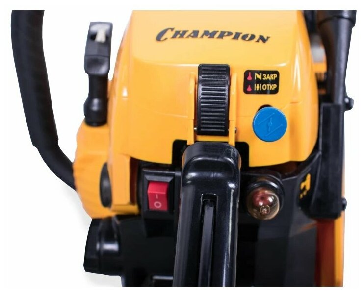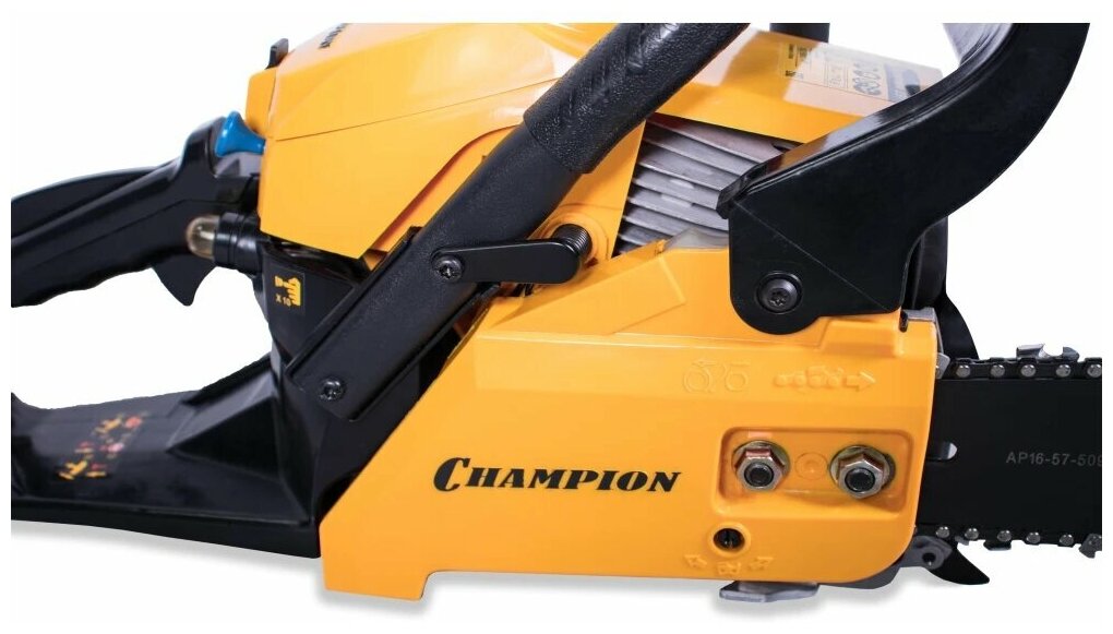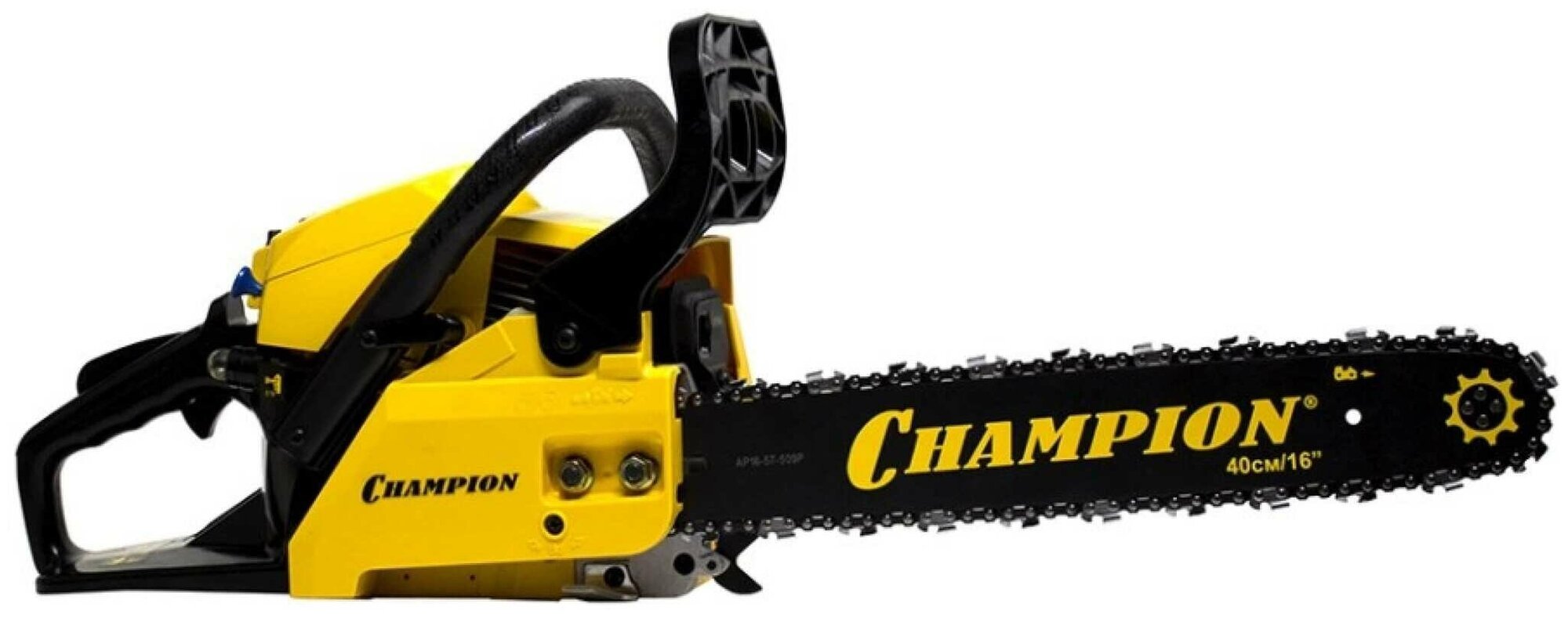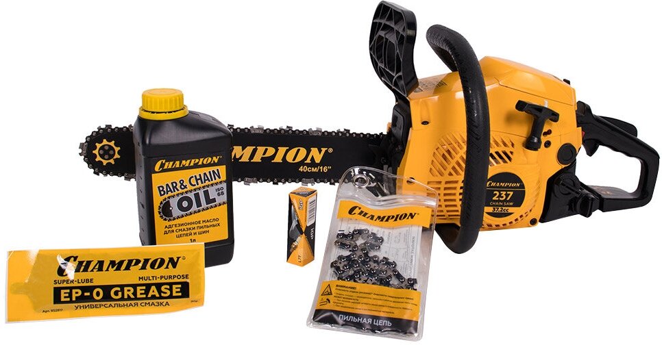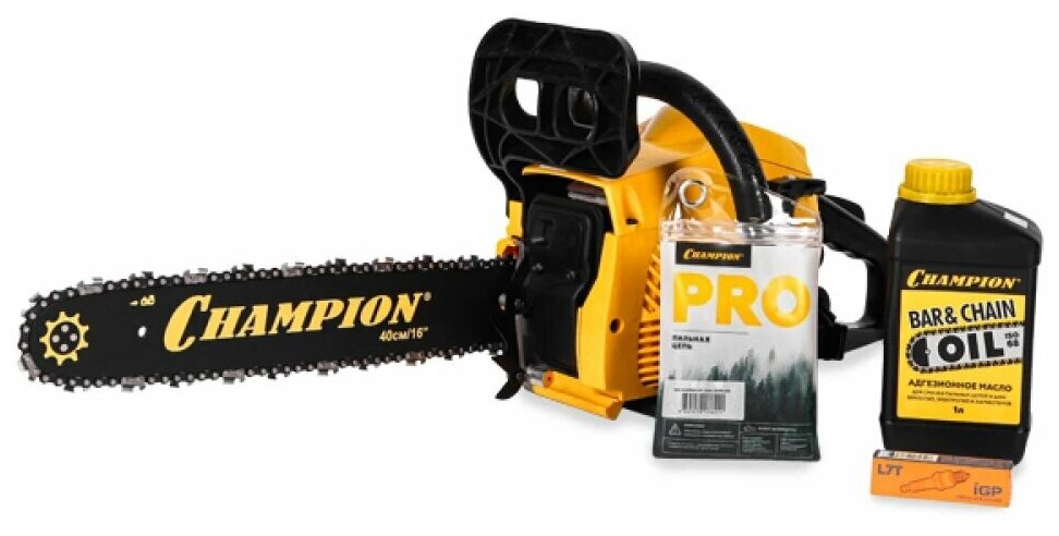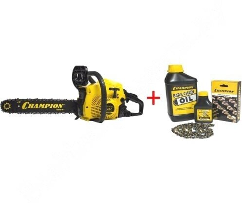 Chainsaw, guide bar, saw chain, spark plug wrench, carburetor adjustment screw driver, champion saw chain and bar oil 1 l, champion fuel additive 0.1 l, champion chain 3/8"-1.3 mm-56 r., instruction manual exploitation