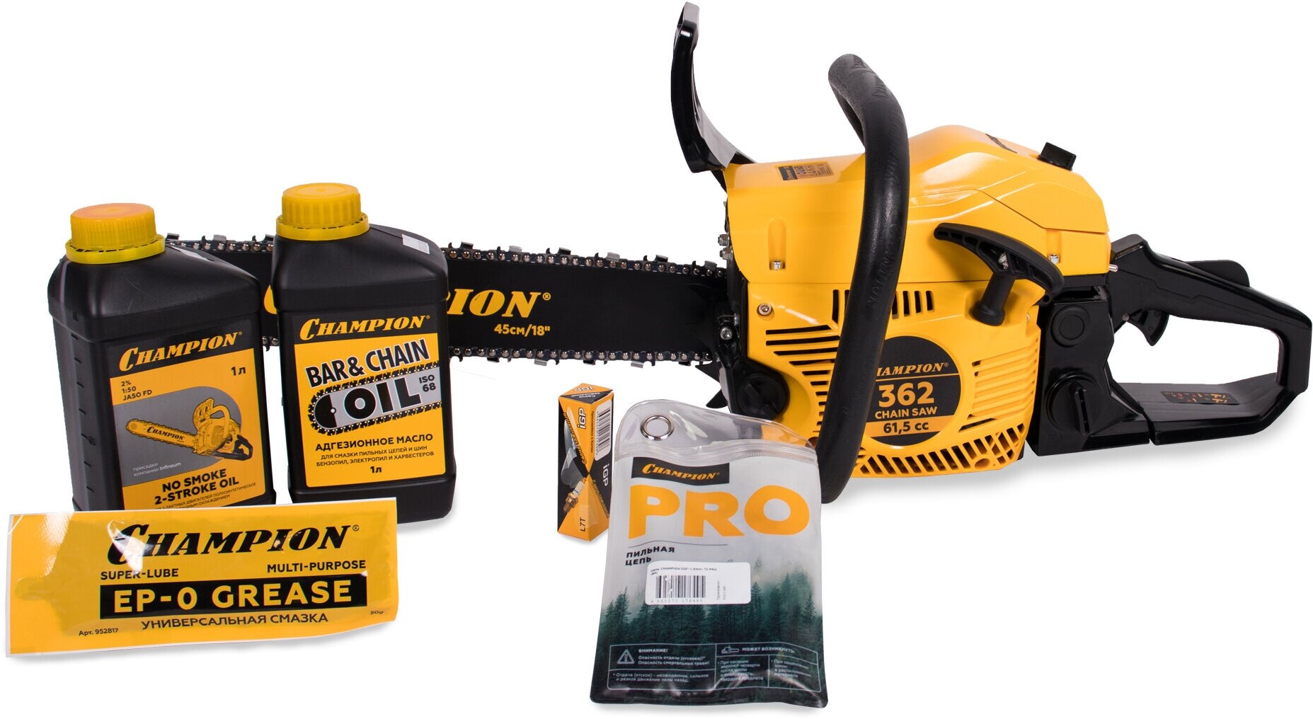 Petrol chainsaw Champion 362-18 + chain and fuel mixture oil, spark plug, grease and chain