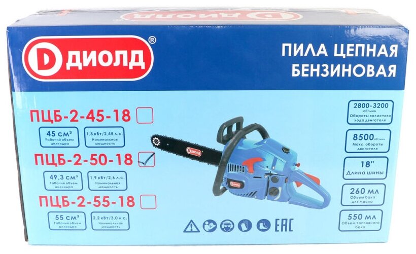 Engine type: gasoline, W: 1900 W, hp: 2.60 hp, tire length: 45 cm, chain pitch: 0.325 inch, engine displacement: 49.30 cm³, weight: 5.80 kg