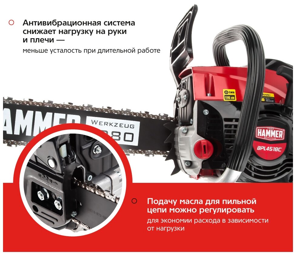 Engine type: gasoline, W: 2000 W, hp power: 2.70 hp, tire length: 45 cm, chain pitch: 0.325 inch, engine size: 45 cm³, anti-vibration, weight: 6 kg