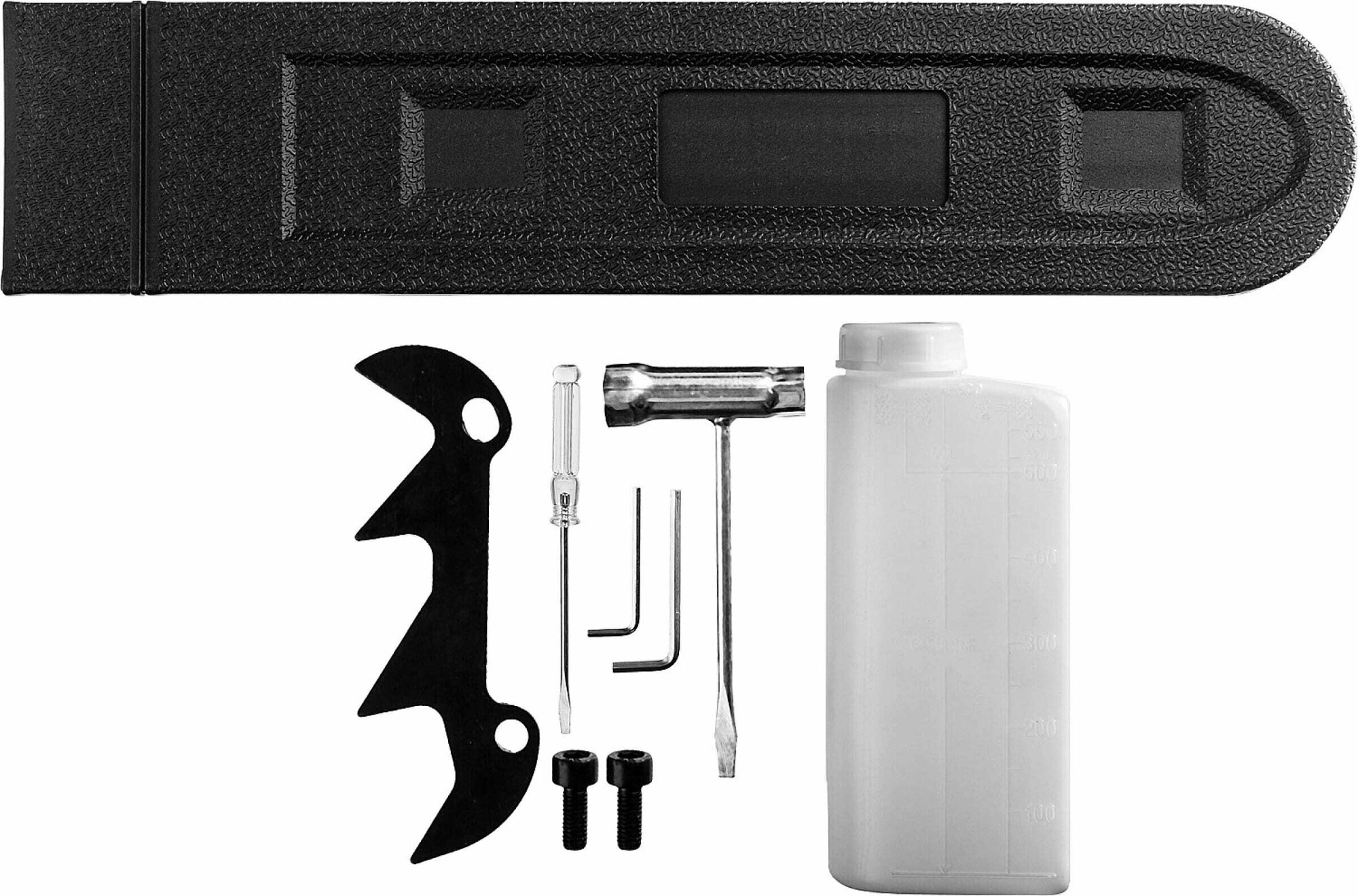Saw, bar, saw chain, bar casing, universal wrench, 2-piece imbus key, toothed stop, mixing container, additional starter coil, instruction manual