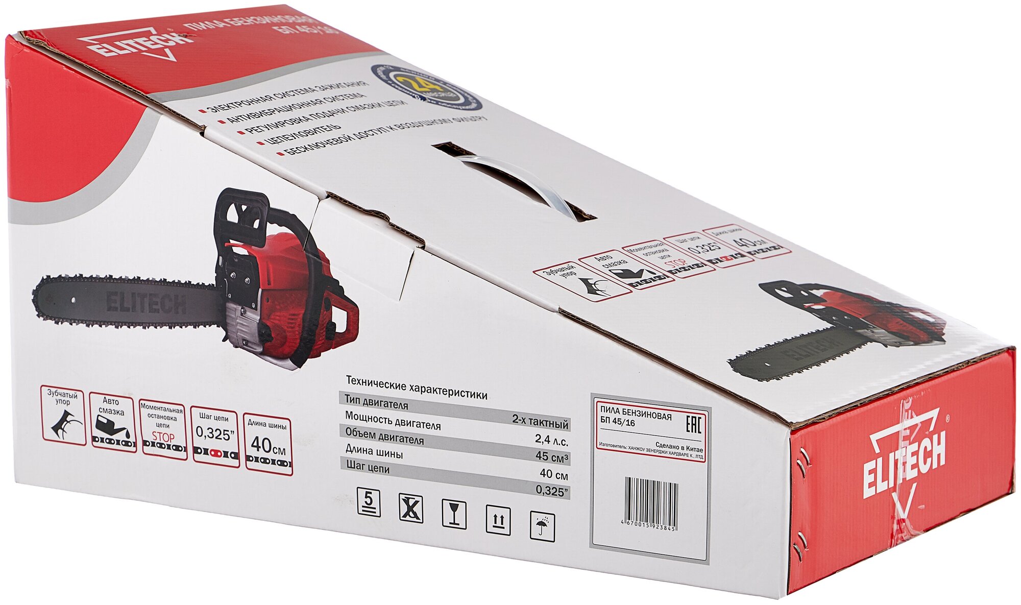 Engine type: gasoline, Power W: 1800 W, HP power: 2.40 HP, bar length: 40 cm, chain pitch: 0.325 inch, engine size: 45 cm³, cutting length: 400 mm, anti-vibration, weight : 6 kg