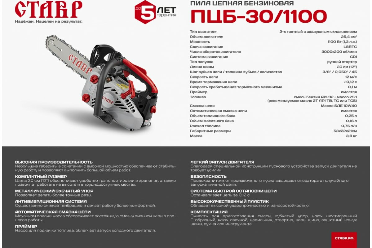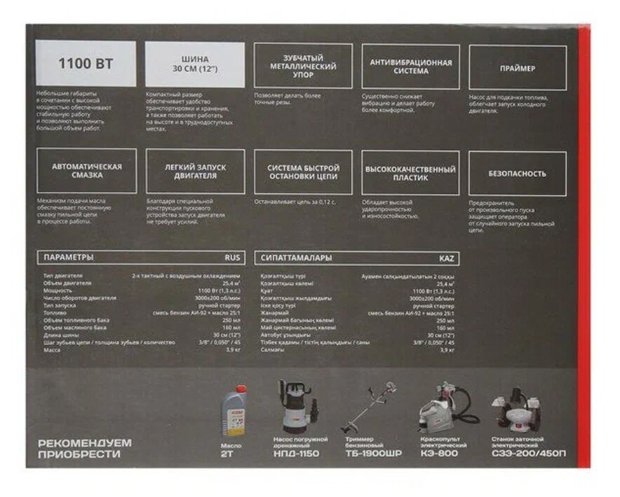Engine type: gasoline, Power W: 1100 W, HP power: 1.30 HP, tire length: 30 cm, chain pitch: 3/8 inch, engine displacement: 25.40 cm³, anti-vibration, weight: 3.90 kg