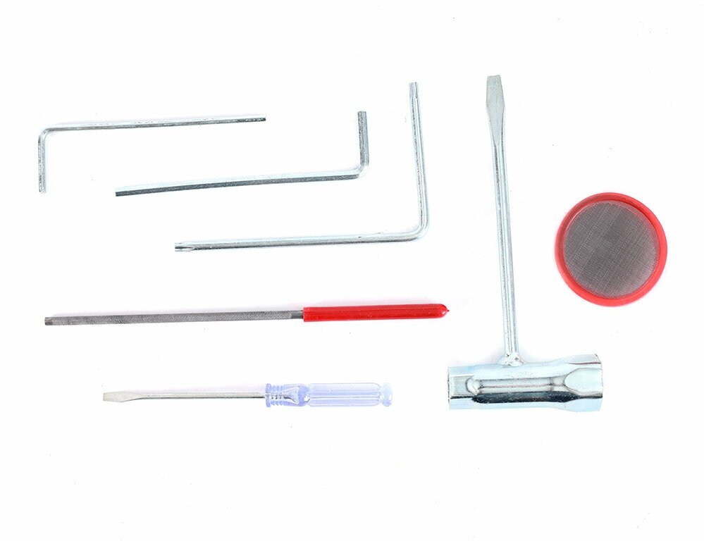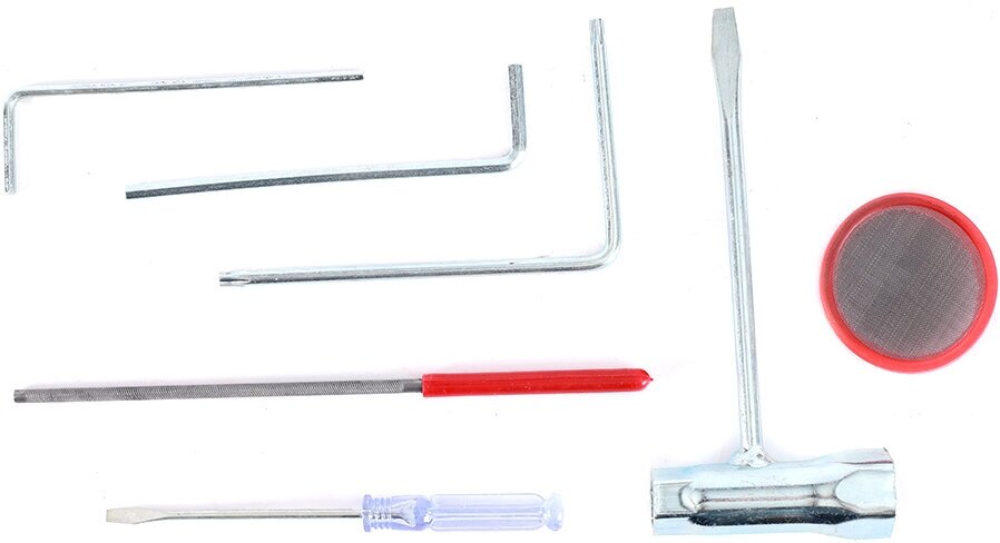 OREGON bar - sprocket with 4 rivets, OREGON chain, file for sharpening the chain, mixing container, funnel with fuel filter, maintenance tool kit