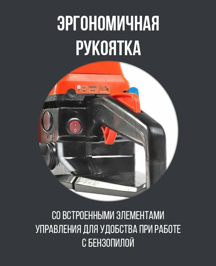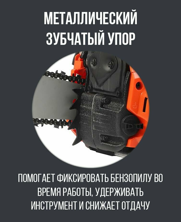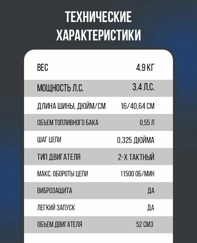 Chainsaw - 1 pc., tire - 1 pc., tire casing - 1 pc., chain - 1 pc., stop with a set of fasteners - 1 pc., set of keys - 1 pc., tank for preparing the fuel mixture - 1 pc. , instruction manual - 1 pc.