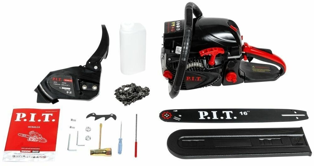 Chainsaw, protective cover, toothed stop, plastic container for mixing, hex wrench, spark plug wrench, flat screwdriver, round file, instruction manual, box