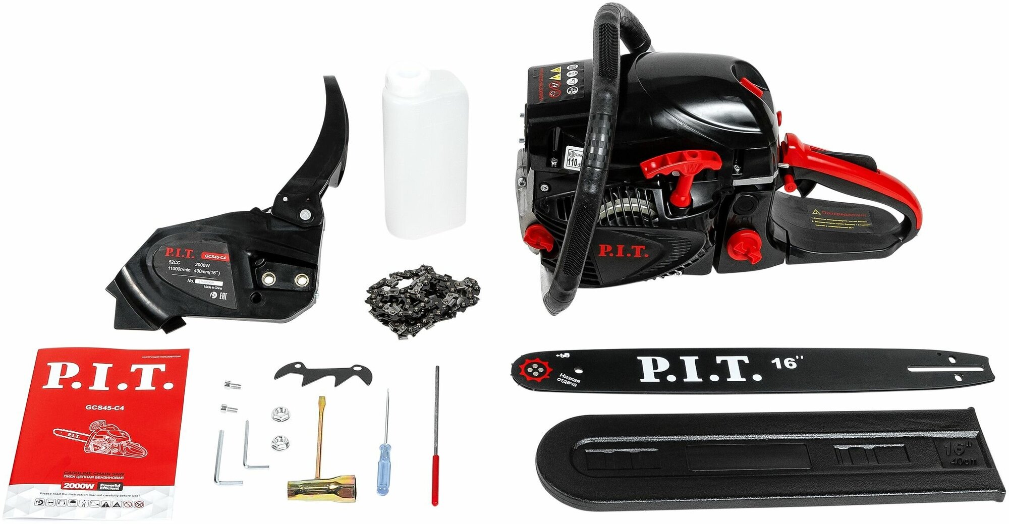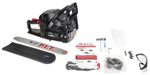 Chainsaw, box, protective cover, toothed stop, plastic container for mixing, hex key - 2 pcs., candle key, flat screwdriver, round file, instruction manual