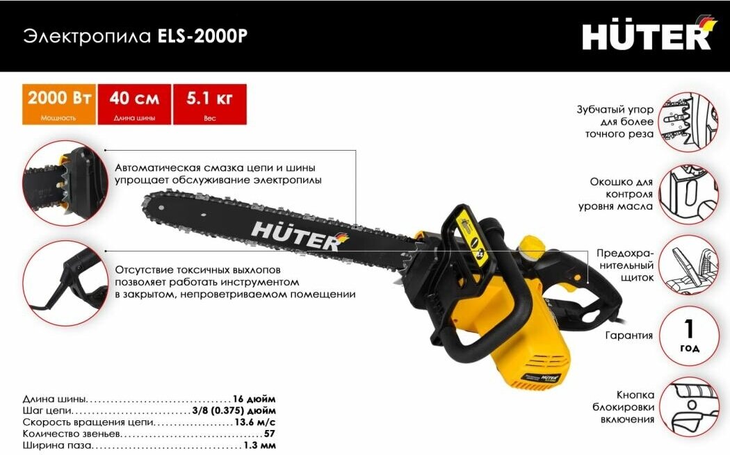 Automatic chain lubrication; oil level indicator; latch to prevent the plug from being disconnected from the socket; number of links: 57 pcs