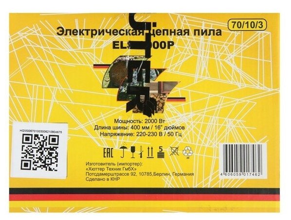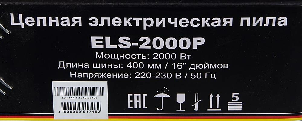 Motor type: electric, power W: 2000 W, bar length: 40 cm, chain pitch: 3/8", cutting length: 400 mm, weight: 7 kg