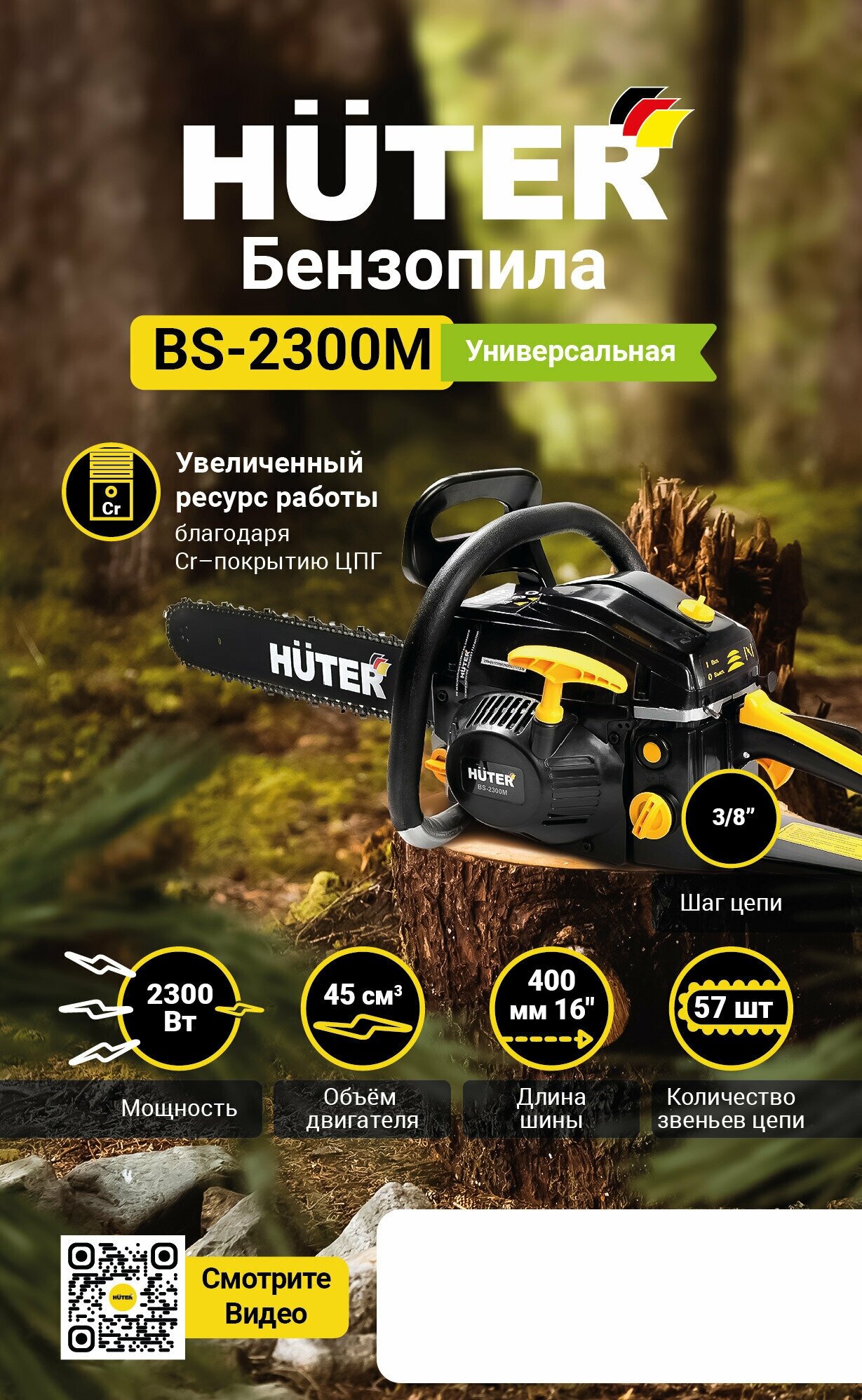 Description: Engine type: gasoline, Power W: 2300 W, HP power: 3.10 HP, bar length: 40 cm, chain pitch: 3/8 inch, engine size: 45 cm³, cutting length: 400 mm, anti-vibration , weight: 6.93 kg