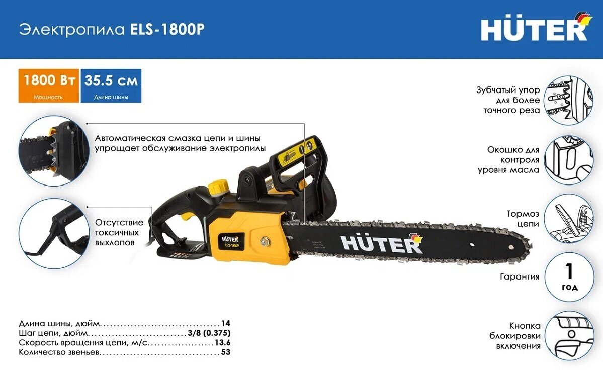 Motor type: electric, Power W: 1800 W, bar length: 35.50 cm, chain pitch: 3/8 inch, cutting length: 355 mm, weight: 5.18 kg