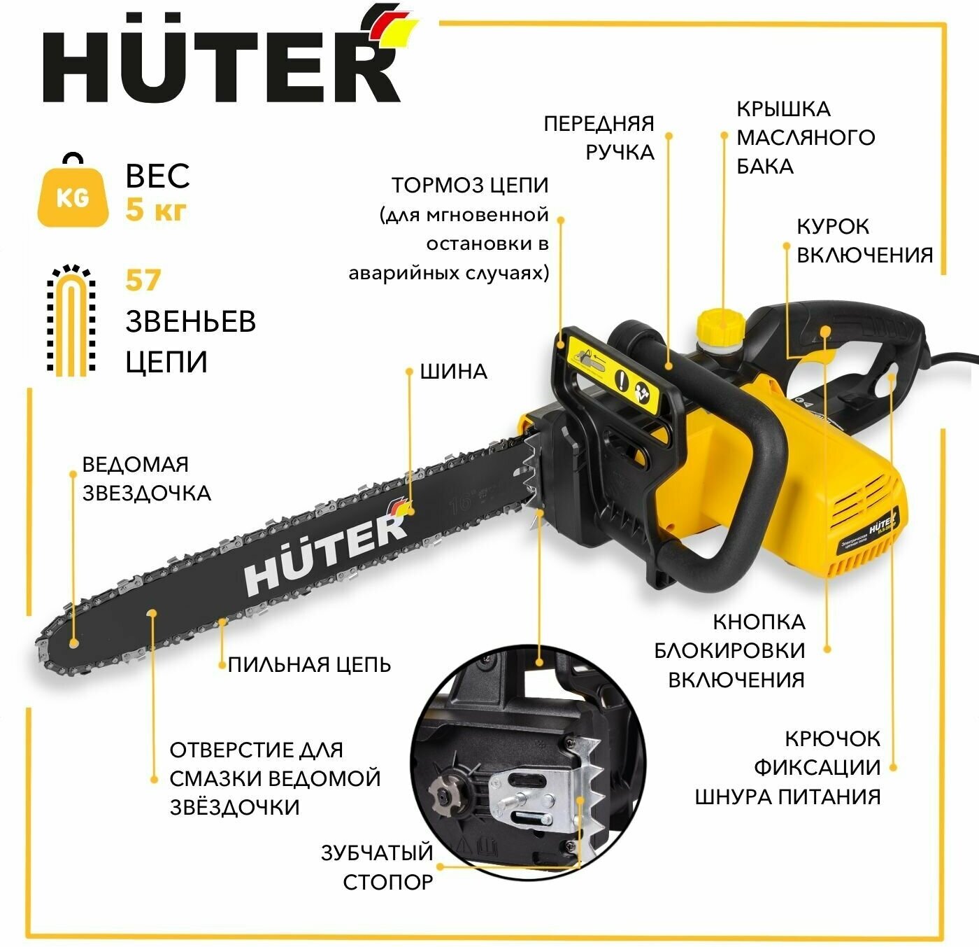 Automatic chain lubrication; oil level indicator; latch to prevent the plug from being disconnected from the socket; number of links: 57 pcs