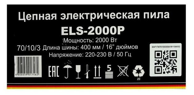 Motor type: electric, power W: 2000 W, bar length: 40 cm, chain pitch: 3/8, cutting length: 400 mm, weight: 7 kg