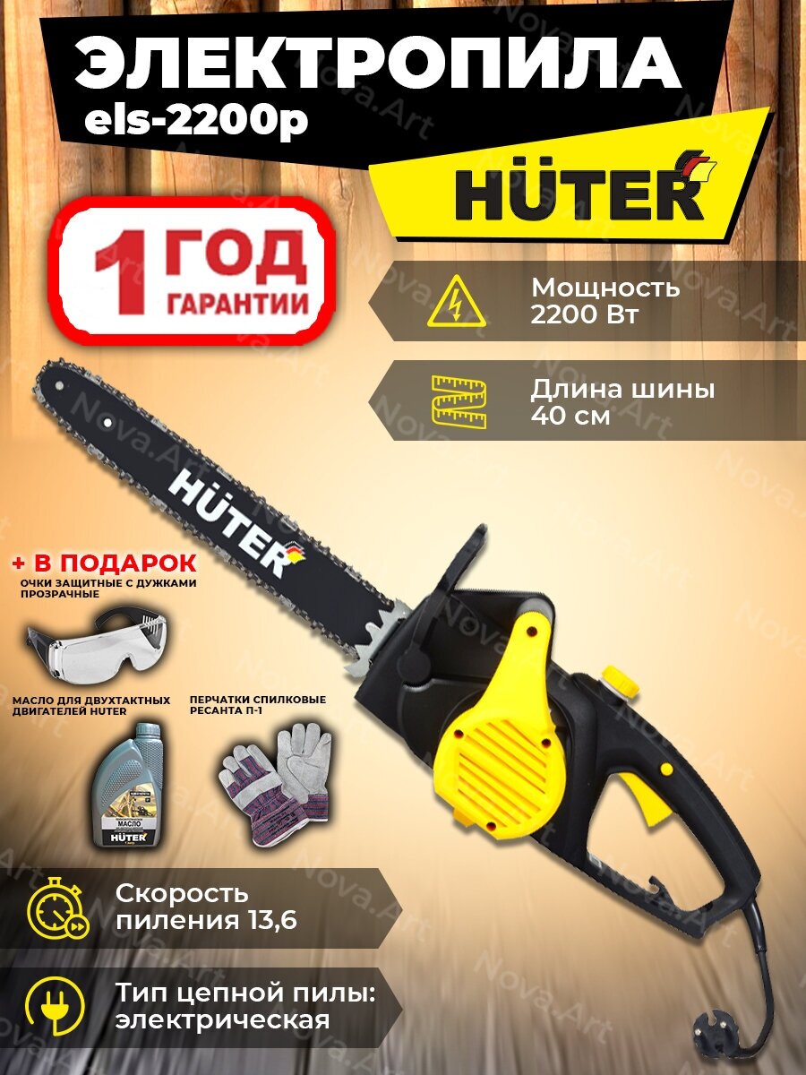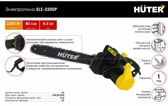 Motor type: electric, Power W: 2200 W, HP power: 2.90 HP, bar length: 40 cm, chain pitch: 3/8 inch, cutting length: 400 mm, soft start, weight: 5.20 kg