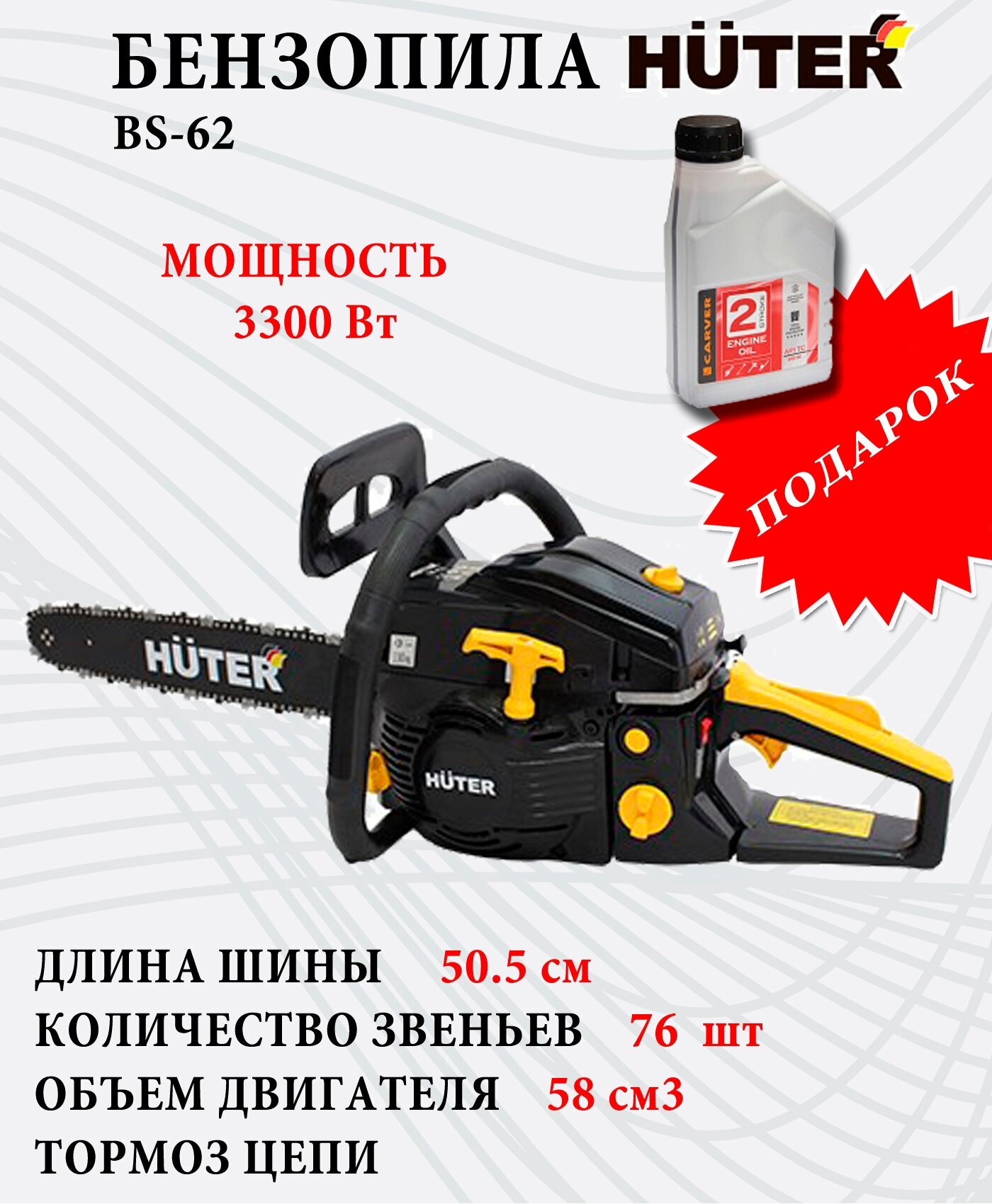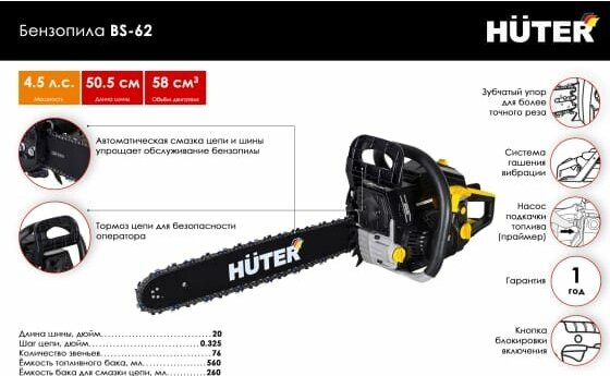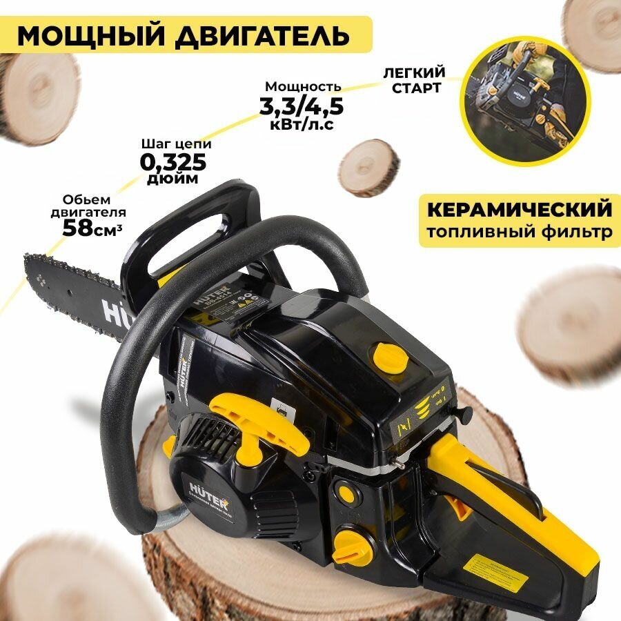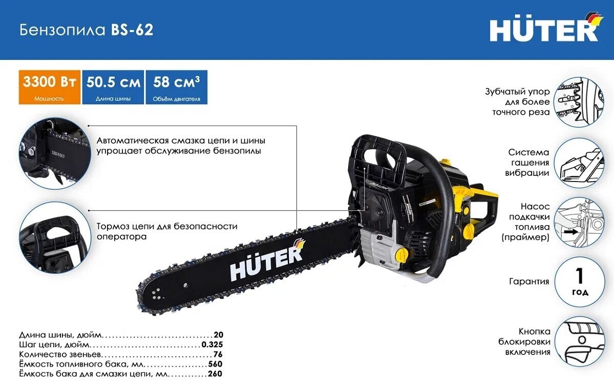 Engine type: gasoline, W: 3300 W, hp: 4.49 hp, bar length: 50.50 cm, chain pitch: 0.325 inch, engine displacement: 58 cm³, cutting length: 500 mm, anti-vibration, smooth start, weight: 7.50 kg