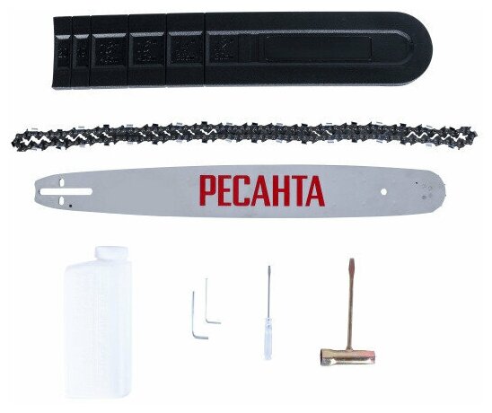 Chainsaw - 1 pc., bar - 1 pc., chain - 1 pc., protective casing of the bar - 1 pc., container for mixing the fuel mixture - 1 pc., product data sheet - 1 pc., set of tools and accessories - 1 pc. .