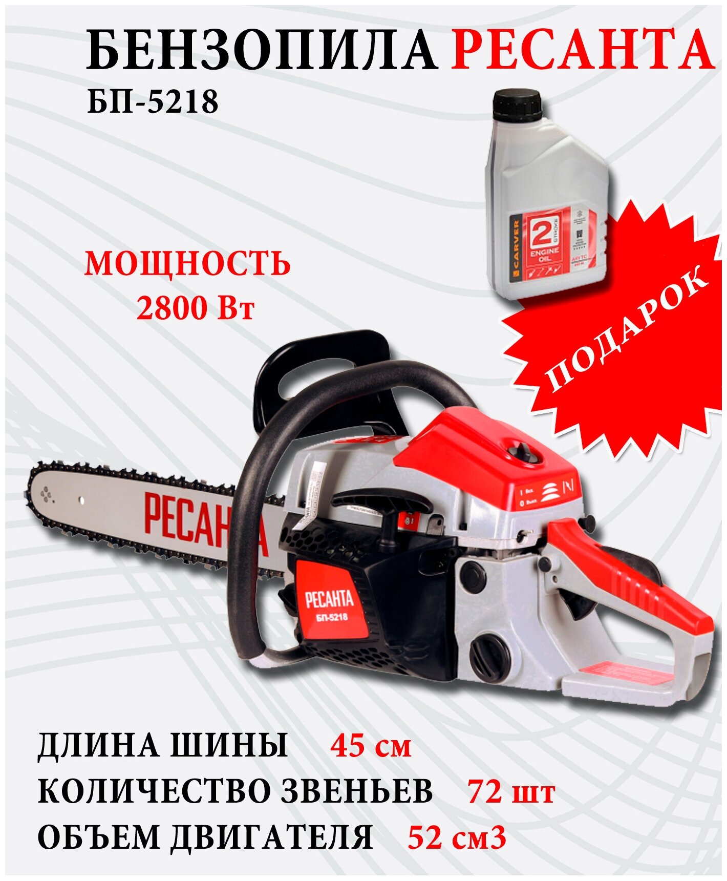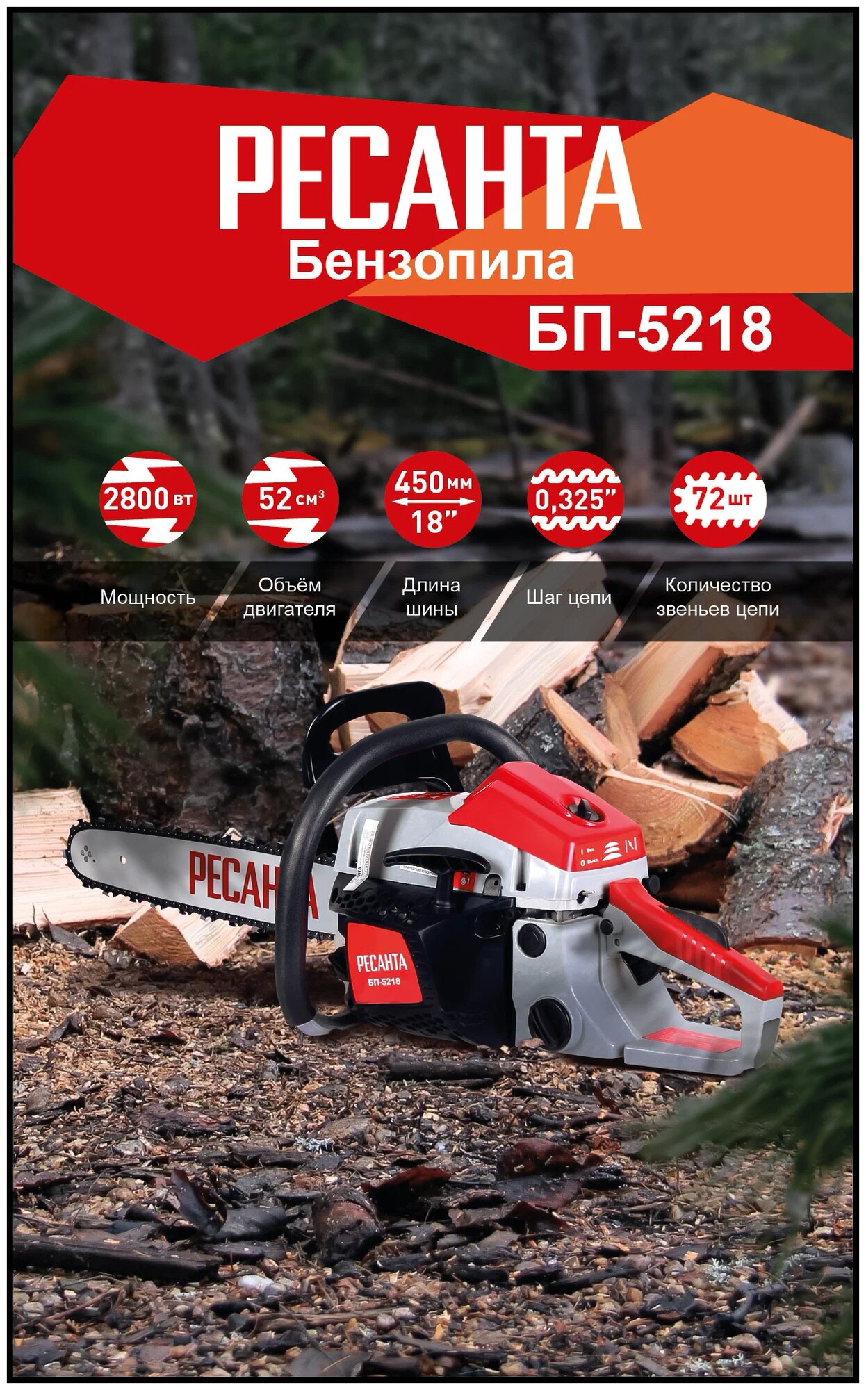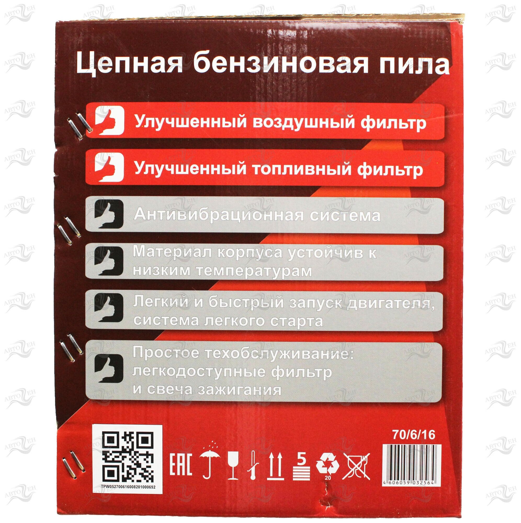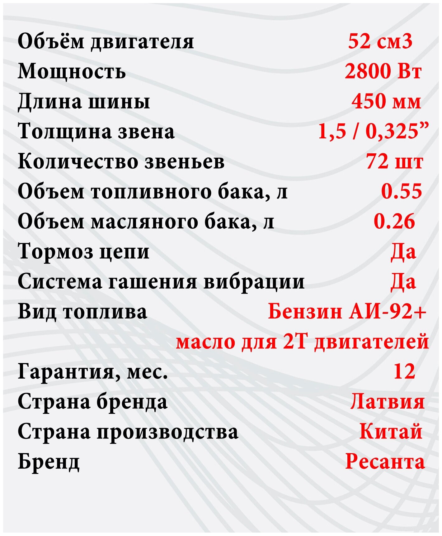 Link thickness: 1.5 mm, number of chain links: 72 pcs., type of fuel: gasoline AI-92 + oil for 2T engines, engine type: 2-stroke, air-cooled