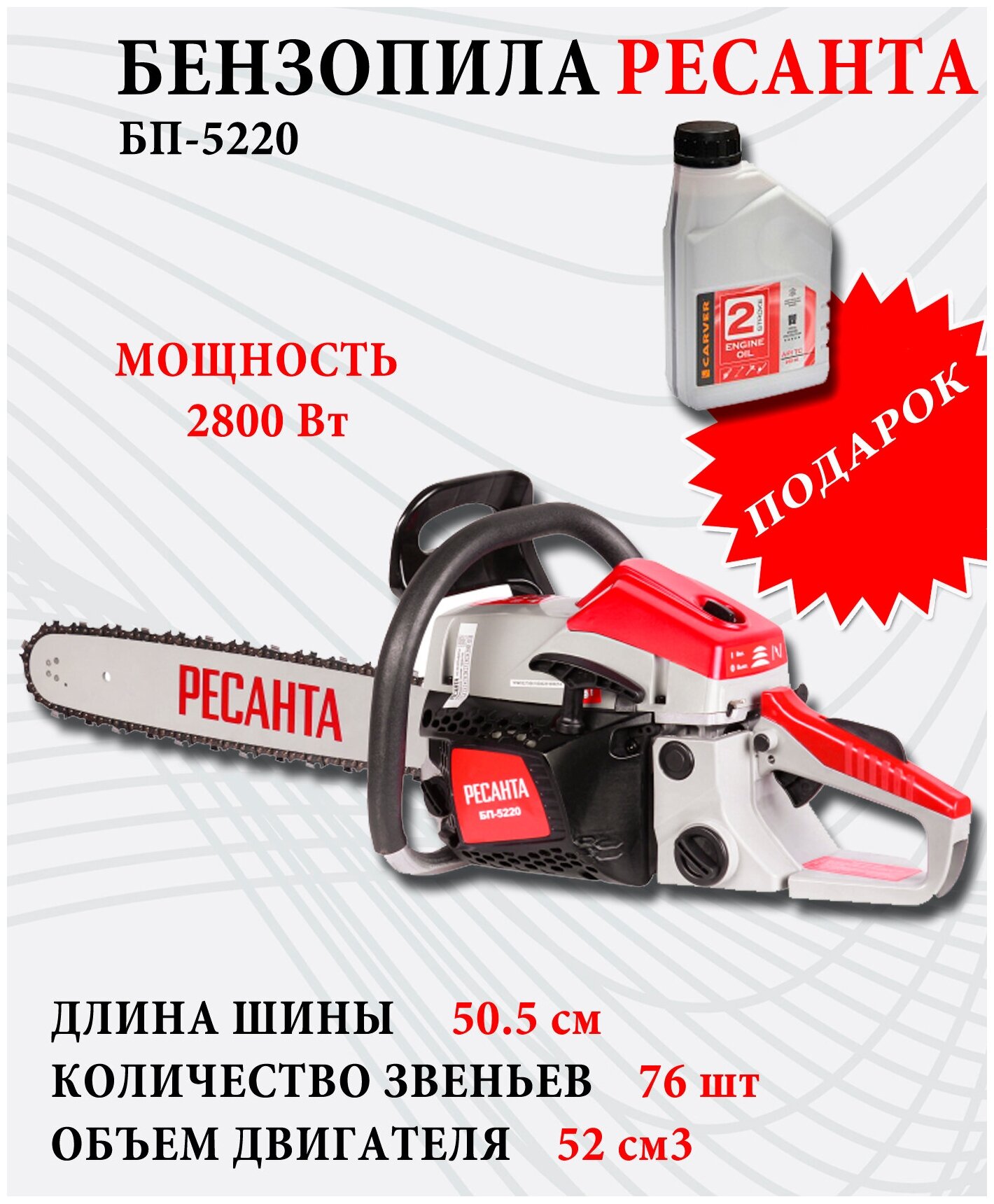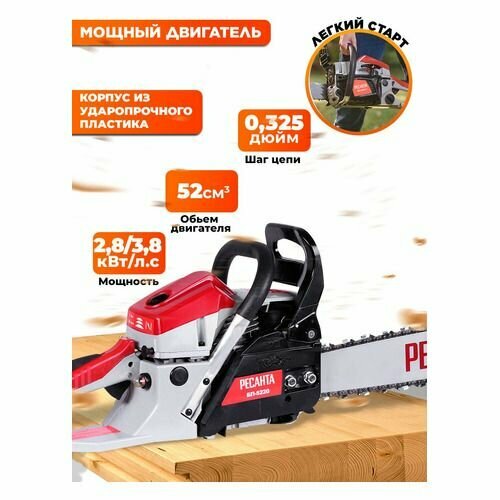 Link thickness: 1.5mm, number of chain links: 76 pcs., fuel: AI-92 gasoline + oil for 2T engines, engine type: 2-stroke, air-cooled
